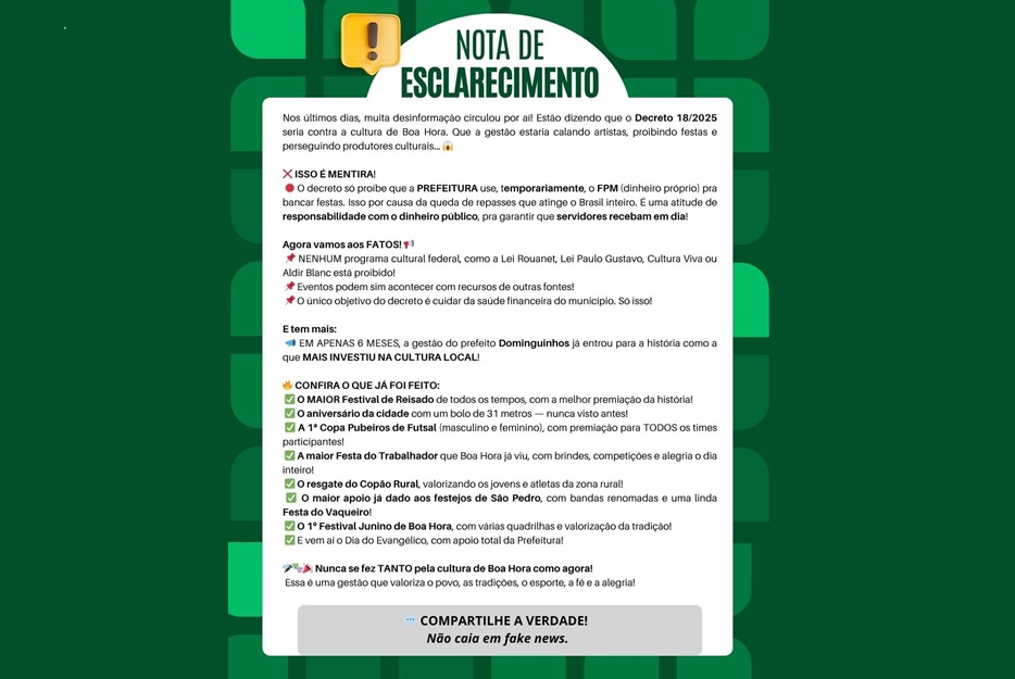 Sobre o Decreto nº 18/2025 – Contenção de Gastos e Compromisso com a Cultura A Prefeitura Municipal de Boa Hora, por meio desta nota, vem esclarecer à população os objetivos e o alcance do Decreto nº 18, de 02 de julho de 2025, recentemente publicado. O decreto tem como finalidade garantir o equilíbrio fiscal da […]